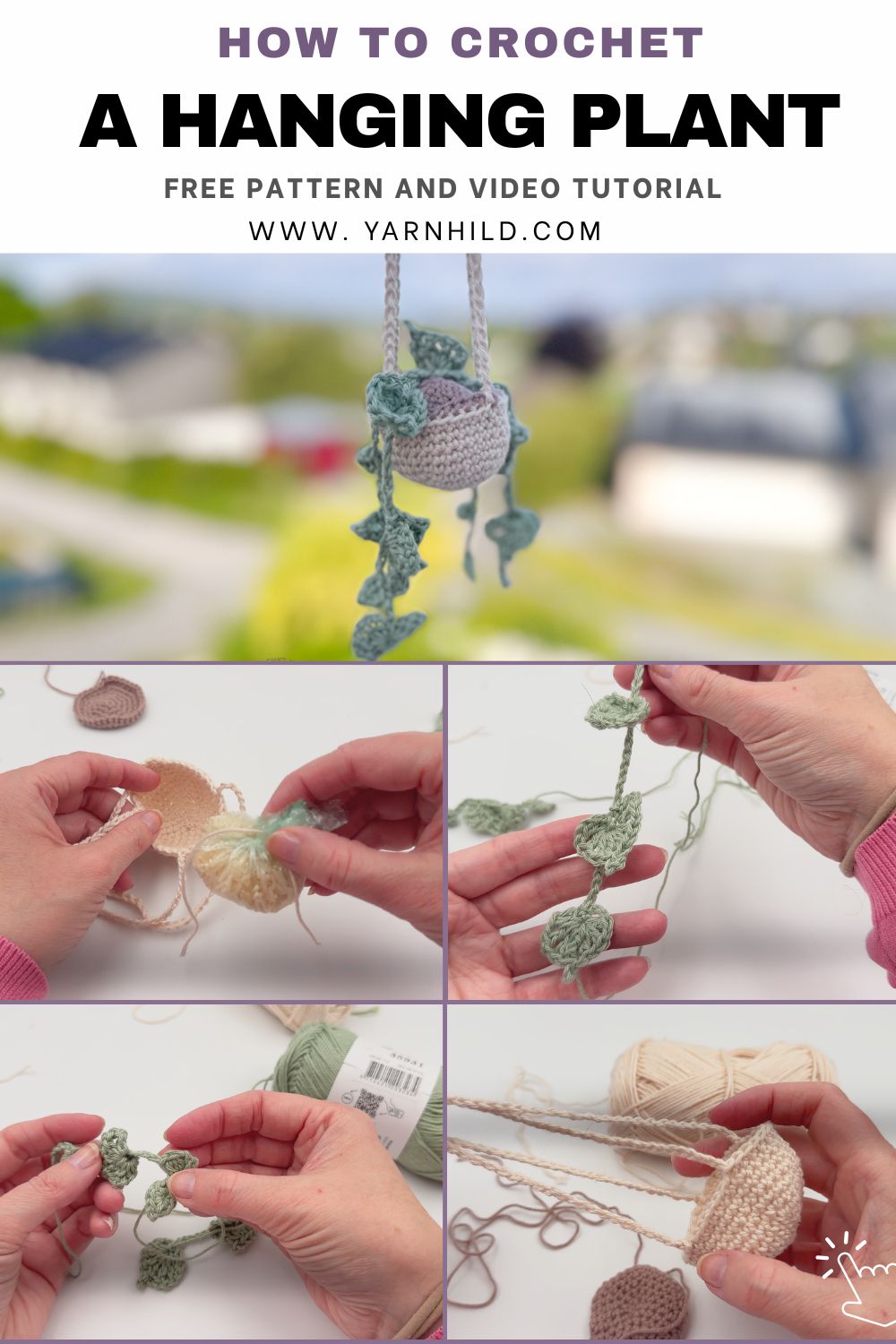 This tutorial teaches you how to crochet a cozy little pot with squishy soil and soft, leafy vines. You can customize the leaves and add your touch to the hanging plant.