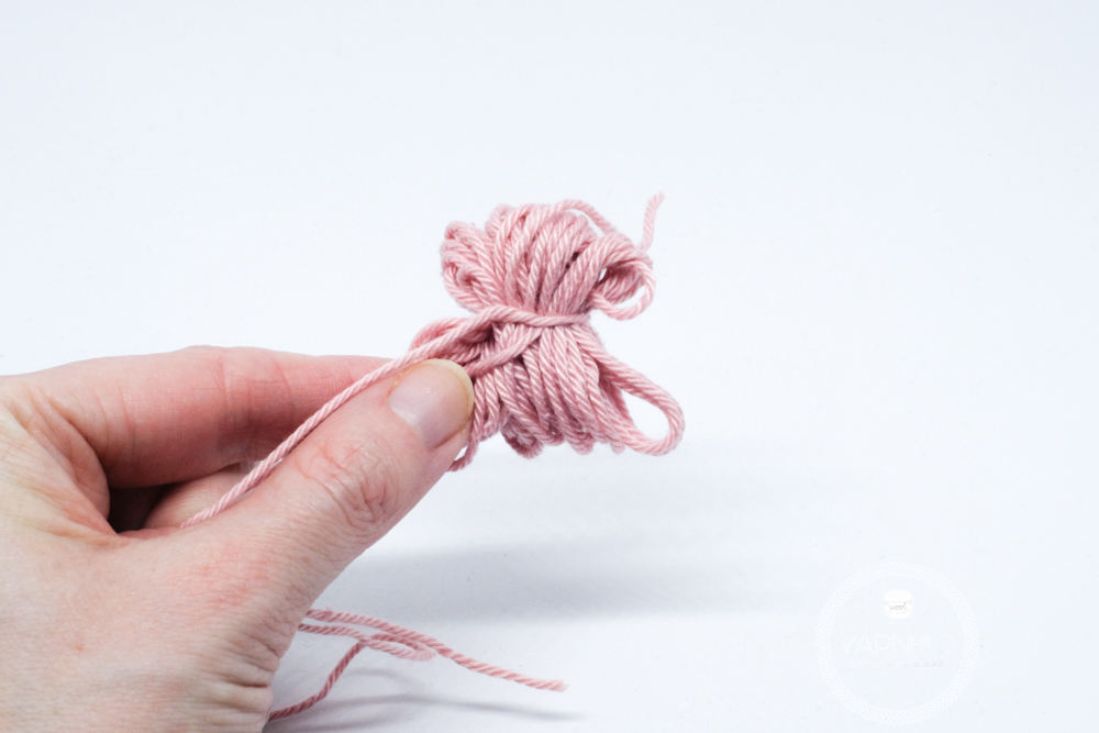 Wind some yarn between two fingers. Pull the work away from your fingers and lay it down. Grab a strand of yarn and tie it around like shown on the picture.
