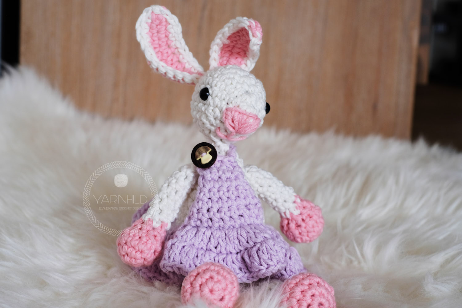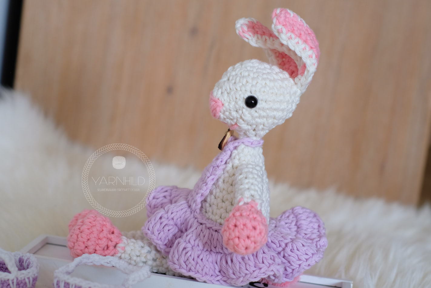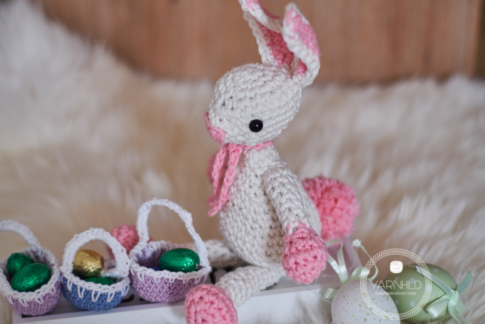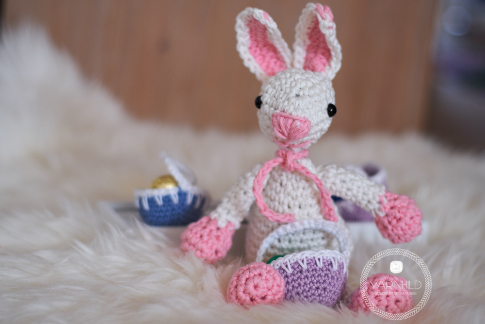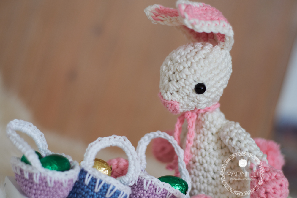 Hello friends! Meet Heidi - she is a happy little crochet bunny and she is preparing her easter baskets for the holiday. The baskets are filled with delicious chocolate eggs which she will hide in the garden for the children to find. She is so exited for easter and she just crocheted her self a dashing dress in a bright purple to match her baskets. When she isn't hiding eggs in the garden, she is busy jumping around and practising her jumping technique. Those easter eggs have to be delivered and there is much work to do, so practising jumping technique is mandatory.